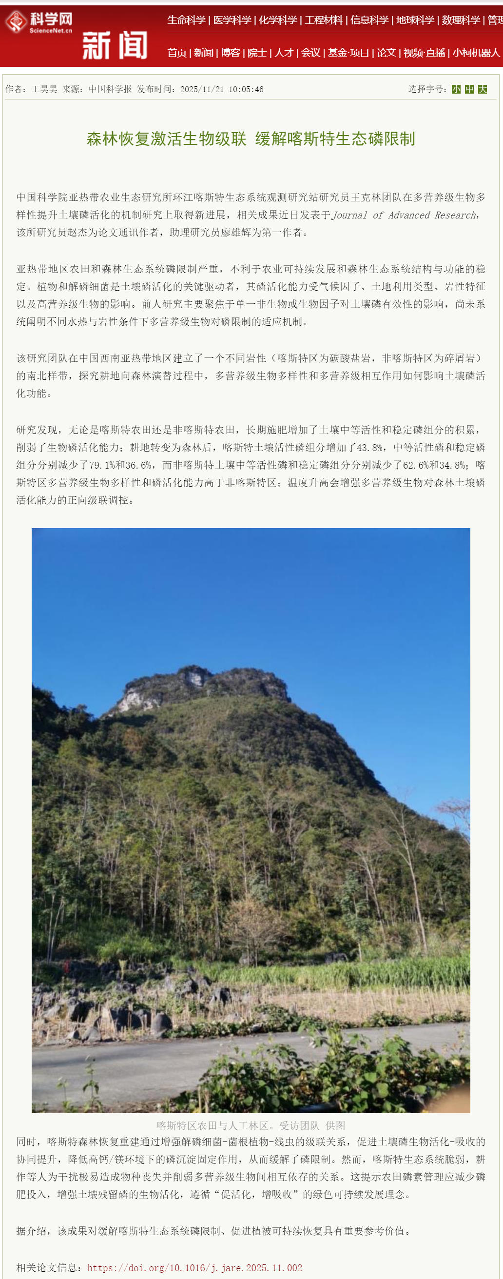 【科学网】森林恢复激活生物级联 缓解喀斯特生态磷限制