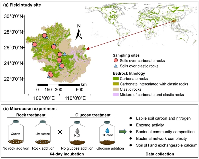 本研究结合野外调查和室内微宇宙培养实验,系统探讨了富钙碳酸盐岩对土壤功能的影响及其微生物机制。野外调查以西南典型水热梯度样带为研究区,对比喀斯特(富钙碳酸盐岩)与非喀斯特(贫钙碎屑岩)土壤功能与微生物网络复杂性,揭示岩石钙含量与土壤功能之间的关联。为进一步验证碳酸盐岩对高钙土壤功能的持续效应,设计了在富钙土壤中添加碳酸盐岩粉末的微宇宙培养实验,检验碳酸盐岩风化是否仍能提升土壤功能潜力。