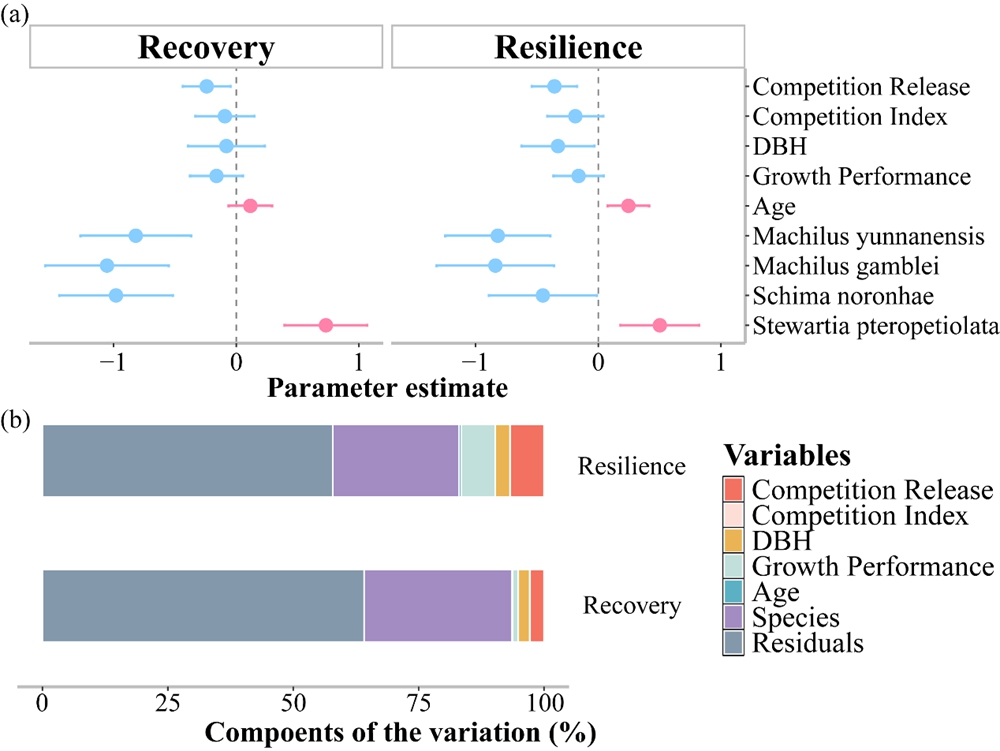 图2:4个树种的竞争释放、竞争指数、胸径、干扰前生长表现和树龄对哀牢山亚热带常绿阔叶树木生长恢复力和弹力影响的线性混合效应模型回归系数