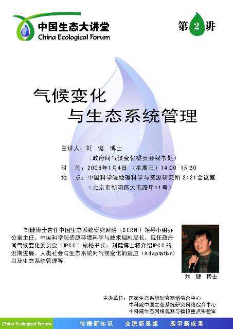 中国生态大讲堂之二 题 目:气候变化与生态系统管理 主讲人:刘 健 博士 (政府间气候变化委员会秘书处) 时 间:2006年1月4日 14:00~15:30 地 点:中国科学院地理科学与资源研究所2421会议室 (北京市朝阳区大屯路甲11号) 主办单位:国家生态系统研究网络综合中心 中科院中国生态系统研究网络综合中心 中科院生态网络观测与模拟重点实验室 刘健博士曾任中国生态系统研究网络(CERN)领导小组办公室主任、中国科学院资源环境科学与技术局副局长,现任政府间气候变化委员会(IPCC)副秘书长。刘健博士将介绍IPCC的近期进展、人类社会与生态系统对气候变化的适应(Adaptation)以及生态系统管理等。 中国生态大讲堂的宗旨是“传播新知识、交流新思想、展示新成果”。