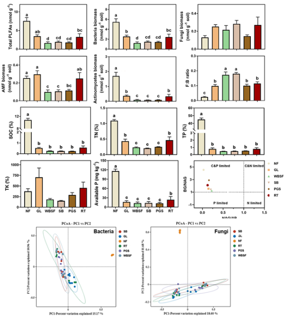 该研究的一个重要突破,在于首次揭示了土壤微生物在热带珊瑚岛生态恢复过程中存在“分工协作”的规律:恢复初期,土壤真菌作为“先锋部队”,凭借其耐旱、耐盐特性高效分解难降解有机质,为植物定植创造条件,并在稳定微生物网络结构中发挥核心作用;随着恢复进程的推进,土壤细菌生物量逐渐增加,成为共现网络中的“模块枢纽”,通过促进碳、氮、磷等元素循环,承担起维持生态系统长期功能与稳定性的“主力军”角色。此外,研究还发现,无论是人工植被还是原生植被,土壤微生物均受到碳、磷养分的协同限制,表明养分供给不足是制约微生物活性及生态恢复效率的关键瓶颈。