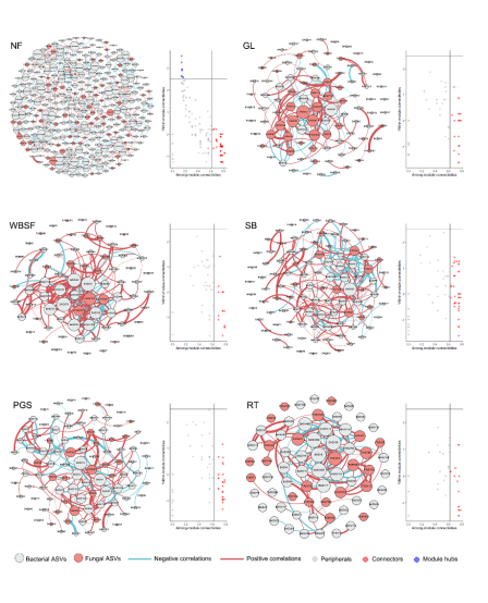 鹤山站恢复生态学团队基于我国热带珊瑚岛的植被长期观测样地,选取了草坪、防风固沙林、防护林、公共绿地和行道树五种典型人工植被,并以原生植被作为生态恢复的参照,综合利用高通量测序、磷脂脂肪酸图谱及共现网络模型等技术,系统追踪了植被恢复早期土壤微生物群落与土壤理化性质的动态变化。