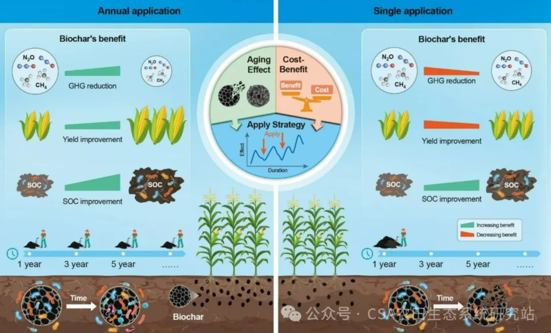 针对这一科学问题,中国科学院南京土壤研究所颜晓元研究员团队联合中国农业大学、沈阳农业大学、英国埃克塞特大学、阿伯丁大学等16家国内外研究机构,基于全球29个长期定位试验点观测数据,结合荟萃分析方法,系统研究了生物炭长期施用对作物产量、温室气体排放和土壤有机碳变化的综合影响及其机制,并揭示了不同土壤—气候—管理条件下的响应规律。研究发现,长期连续施用生物炭可平均提高作物产量10.8%,降低CH₄和N₂O排放13.5%和21.4%,大幅提高土壤有机碳含量52.5%。相比之下,一次性大剂量施用的效果随生物炭老化逐渐衰退,该结论在长期试验中获得验证。