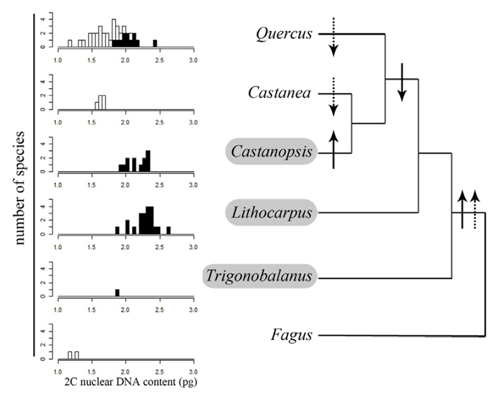 生态进化生物学组的科研人员以北半球广泛分布的壳斗科为研究对象,分析总结了78种壳斗科植物的基因组大小数据,探讨木本植物中基因组大小与地理分布和系统进化的关系。结果表明壳斗科各类群间约有120%的基因组大小变化,但没有明显的多倍化现象,同时物种内部的基因组大小变化极小,符合木本植物多倍化现象较少、染色体结构较稳定的假说,推测普遍存在于热带树木中的杂婚群可在进化上带来与内源多倍化相似的好处。柯属和栲属等热带类群具有比栗属和水青冈属等温带类群更大的基因组;在温热带均有分布的栎属中,热带分布的青冈亚属植物也具有比温带分布的栎亚属植物更大的基因组;在属间、属内、亚属内等各分类水平上,常绿类群植物也具有比落叶类群植物更大的基因组。因此,壳斗科基因组同时存在增大和缩小两种进化趋势,热带类群比温带类群具有更大的基因组,与地理分布相关,而与系统进化关系不明显。