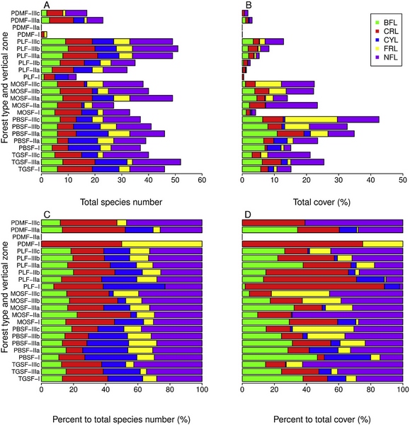 我园恢复生态组李苏博士等在刘文耀研究员的指导下,采取新近倒木调查和攀爬采样相结合的方法,对云南哀牢山地区亚热带森林系统5种森林群落类型内部附生地衣物种组成、多样性及空间垂直分布模式进行了分析研究,以期探讨附生地衣的物种丰富度和垂直分布模式及对森林类型和宿主特征的响应。研究发现,附生地衣的物种数量、组成及盖度在不同类型森林和宿主间均存在明显差异,而树木胸径与树高对附生地衣的物种分布也有一定影响。附生地衣的物种分布存在明显的垂直分层,且明显偏好分布于森林中层区域。壳状地衣、蓝藻地衣、枝状地衣、阔叶地衣和狭叶地衣等五类地衣功能群显示出多样化的垂直分层模式。并且,它们的垂直分层模式受森林类型显著影响,这可能反映出某些地衣种类的生长对光照、湿度等微生境条件的特定需求。本研究结果可为预测亚热带森林环境的变化和山地森林资源的保护和管理提供科学依据。