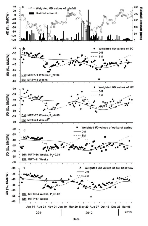 图1 大气降水(a)、溪流水(b, c)、表层岩溶水(d)和土壤基流水(e)的氘同位素季节变化规律及其模型拟合效果