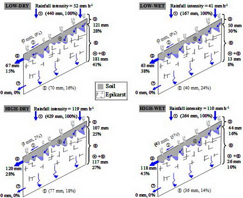 中国科学院亚热带农业生态研究所环江喀斯特站生态修复研究团队付智勇助理研究员在陈洪松研究员和王克林研究员的指导下,针对喀斯特坡面地表径流少、水分去向不明的问题,通过开挖深入基岩的断面(深4m),采用模拟降雨的方法,研究了喀斯特坡面植被-土壤-表层岩溶带体系中三维水文过程及其影响因素,同时结合水量平衡方程,对表层岩溶带蓄水和深层渗漏进行了估算,初步探讨了表层岩溶带水文调蓄功能,并提出了典型喀斯特坡面地上、地下水文过程的概念模型。