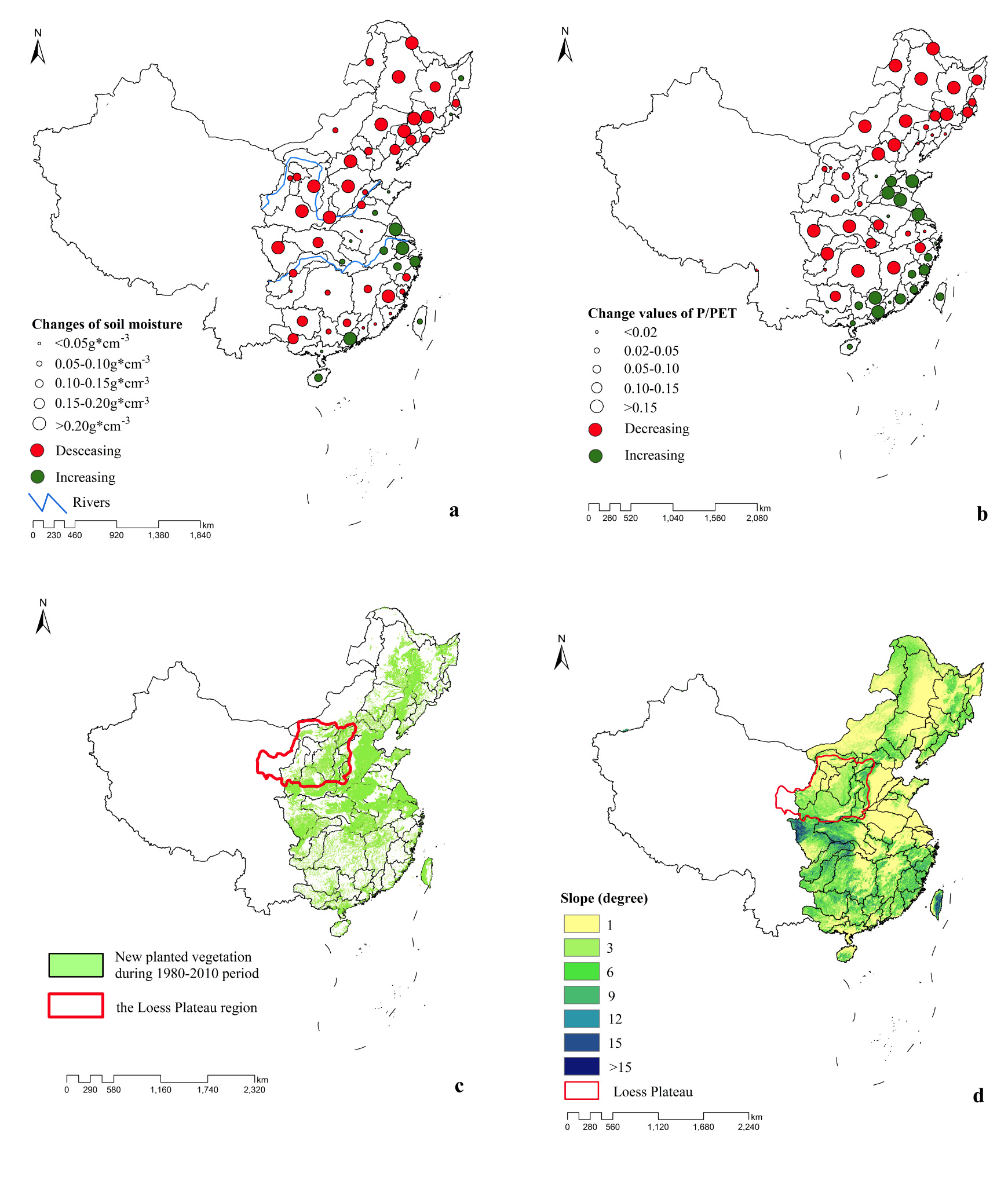 图 (a)表层土壤水分近30年变化趋势;(b)综合气候因子(降雨/潜在蒸散力)近30年变化趋势;(c)近30年新增绿地面积分布;(d)坡度图