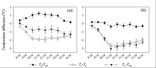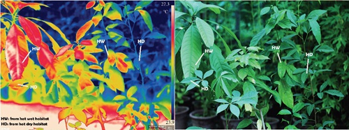 图1 相同环境下,干热河谷植物(HD)和热带雨林植物(HW)的叶片红外温度图像